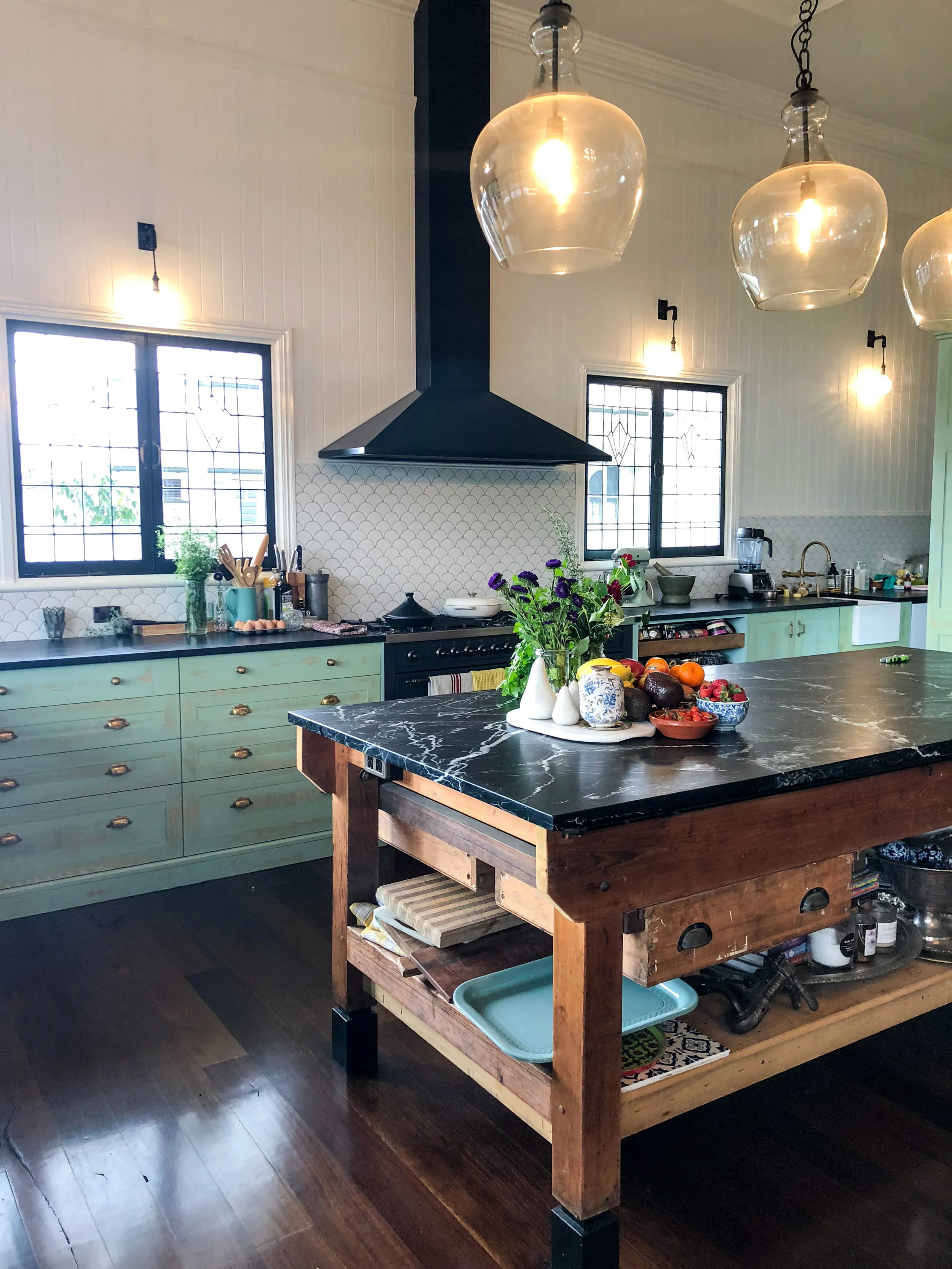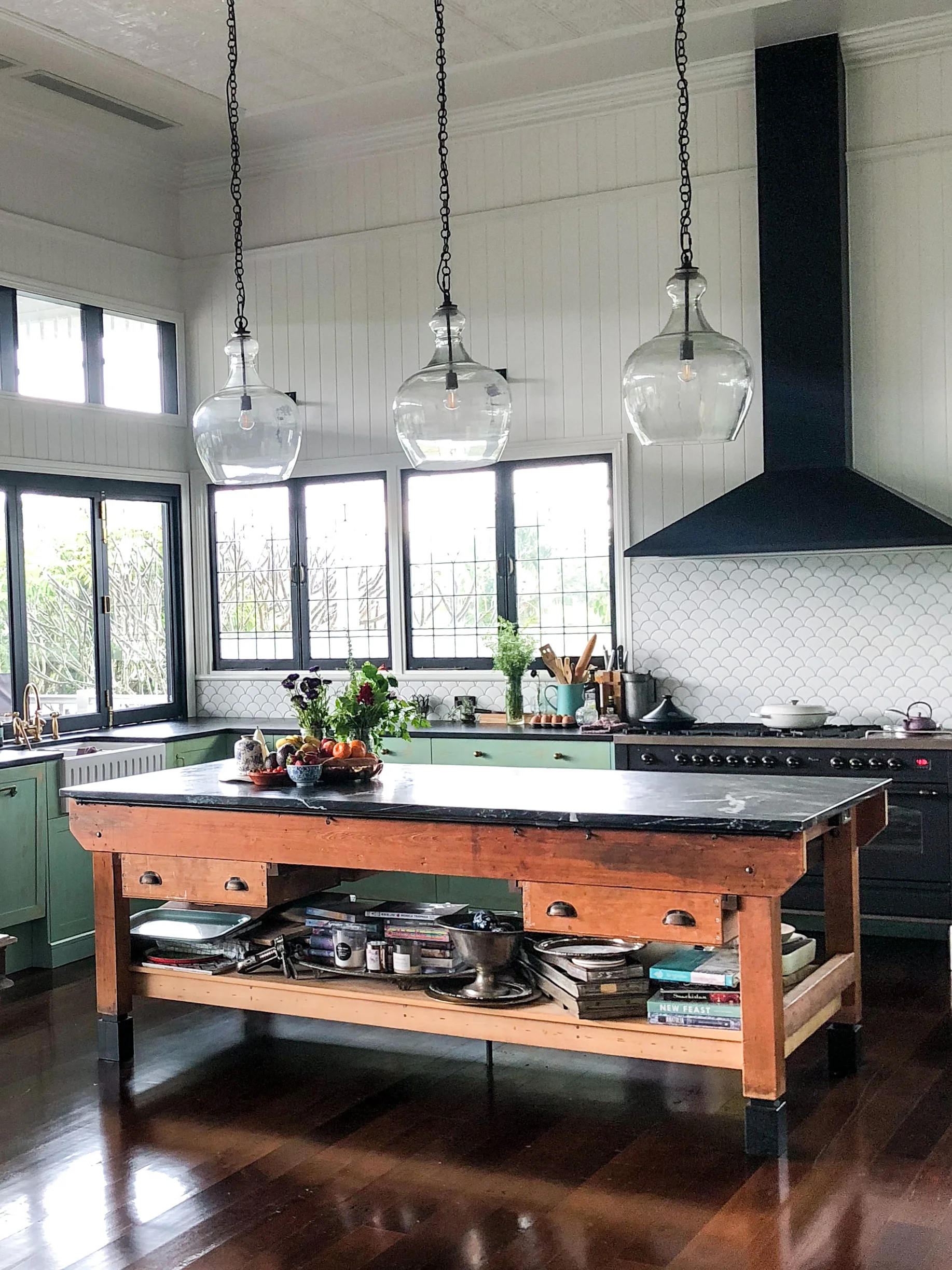 My clients found this old Hoop Pine engineers work bench which they wanted to incorporate into their new house, I removed the top, which is in the process of being remodeled into an outdoor table. The height was increased to match the cabinetry and I added a Hoop pine shelf constructed from old Hoop floor boards. Then the granite top was added to create this fantastic addition to this amazing kitchen.